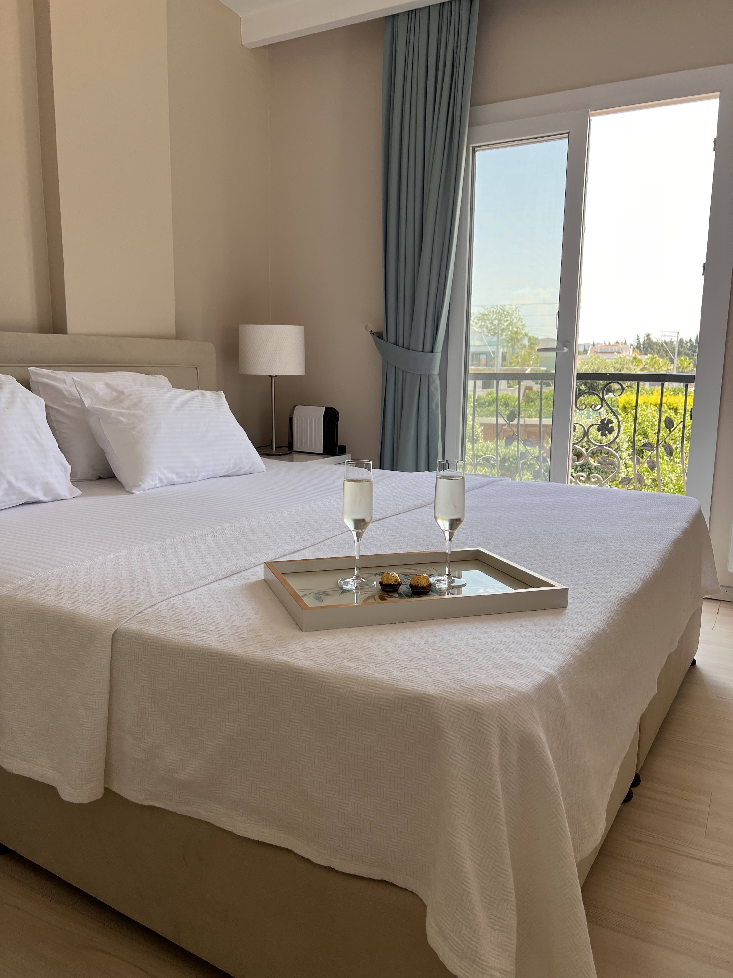 Çift kişilik king size yatak, klima, uydu TV, espresso makinası, minibar, saç kurutma makinası.
